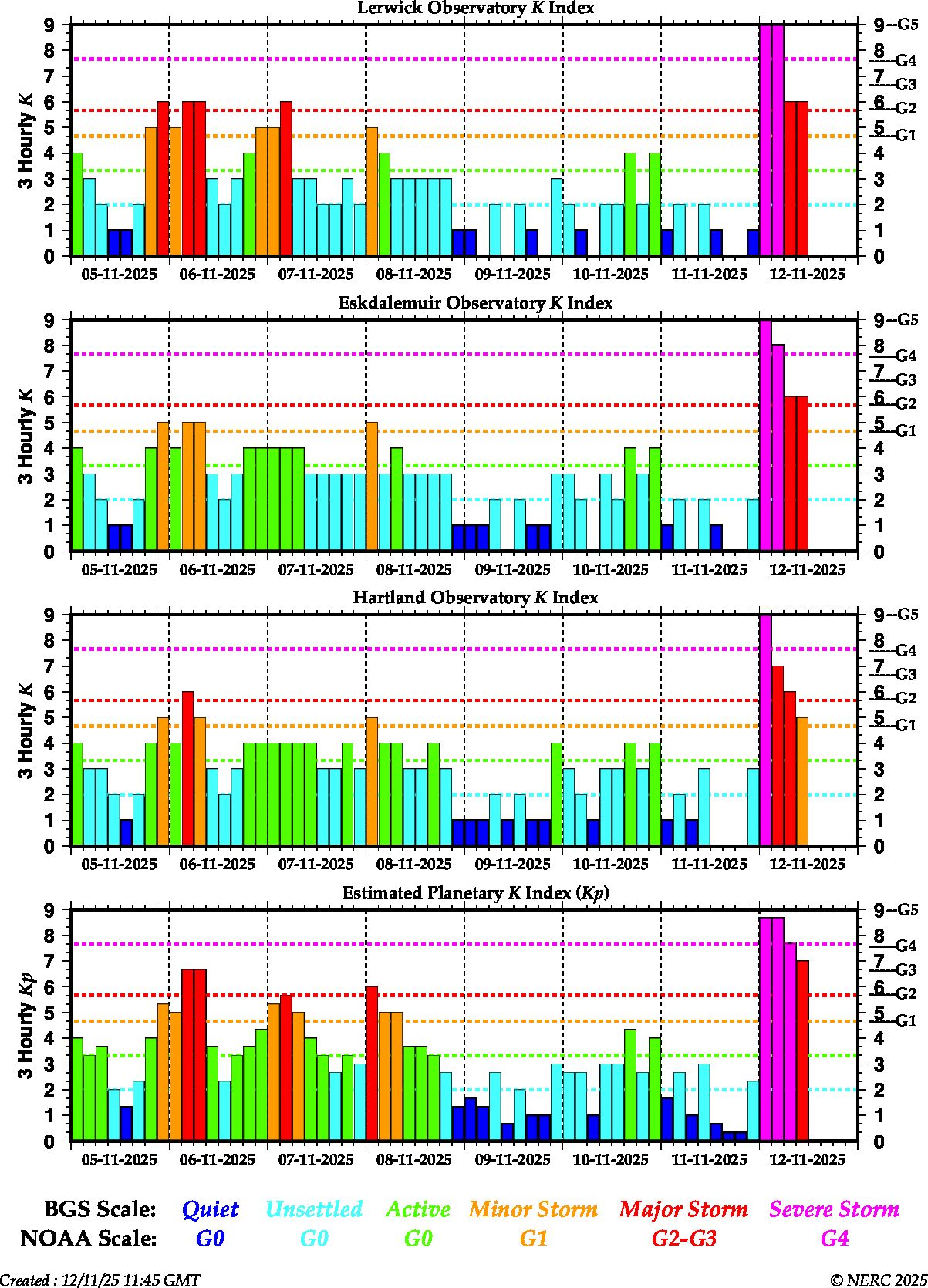 Kp index (a measure of geomagnetic activity) showing the storm intervals up to 12 November. Source: BGS (c) UKRI 2025.